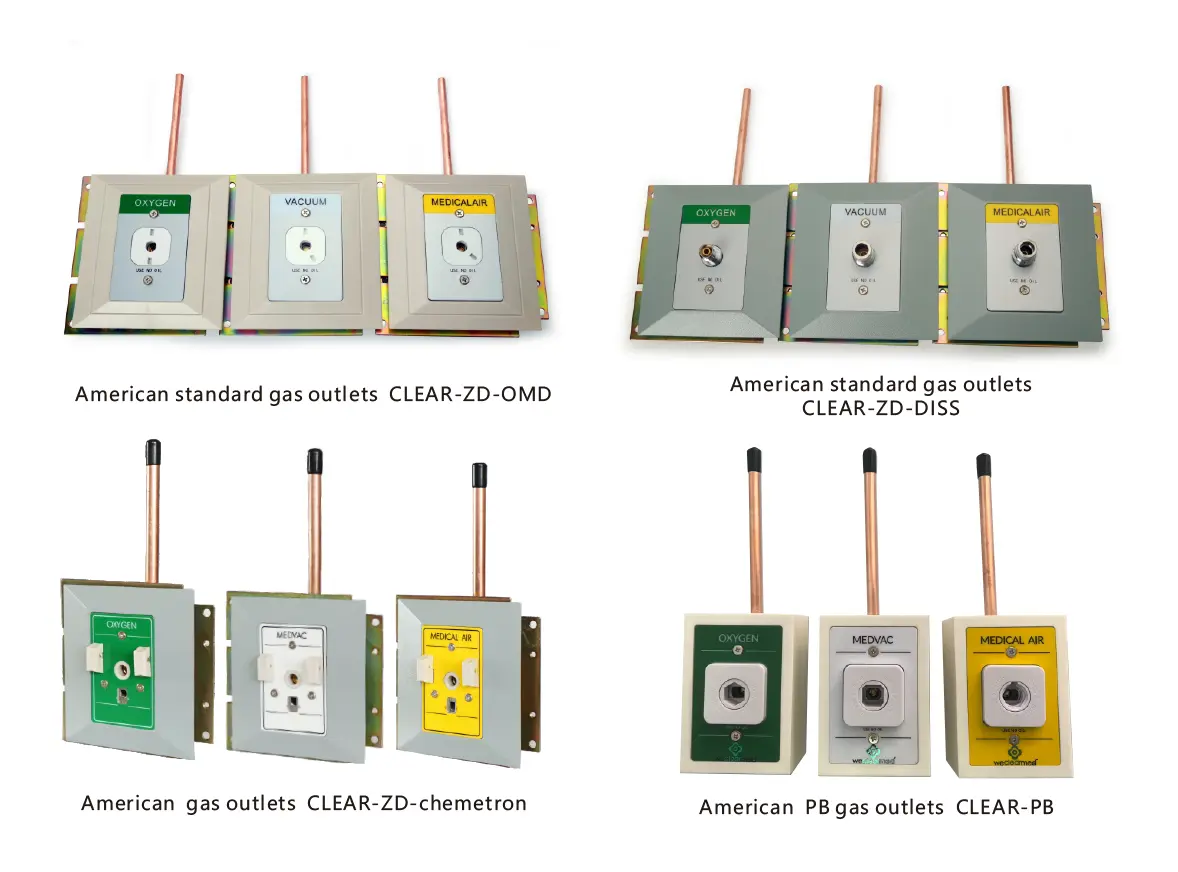 2. Naudokite JAV spalvų standartą, kad nustatytumėte dujas: Dujoms atskirti naudojami kvadratiniai laiko tarpsniai su skirtingais kampais, kad būtų išvengta skirtingų dujų kištukų. Amerikos standartinės dujų išleidimo angos yra tinkamos „Ohmeda Dis PB Chemetron“ amerikietiškiems kištukams